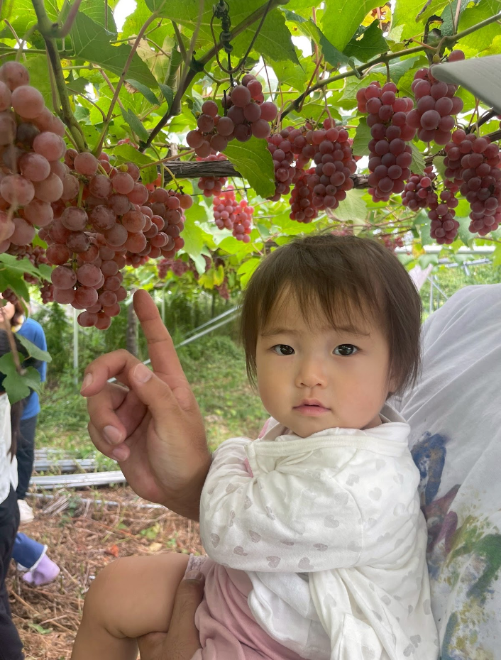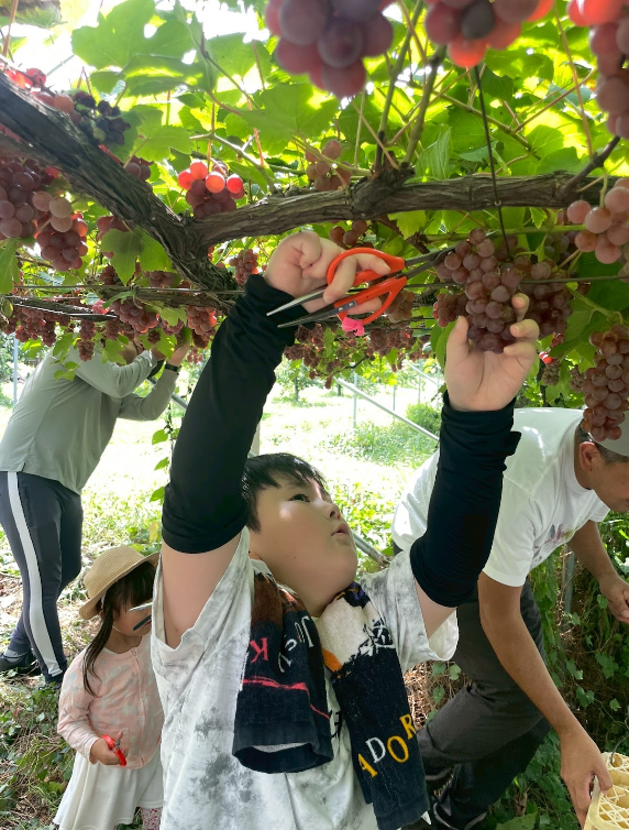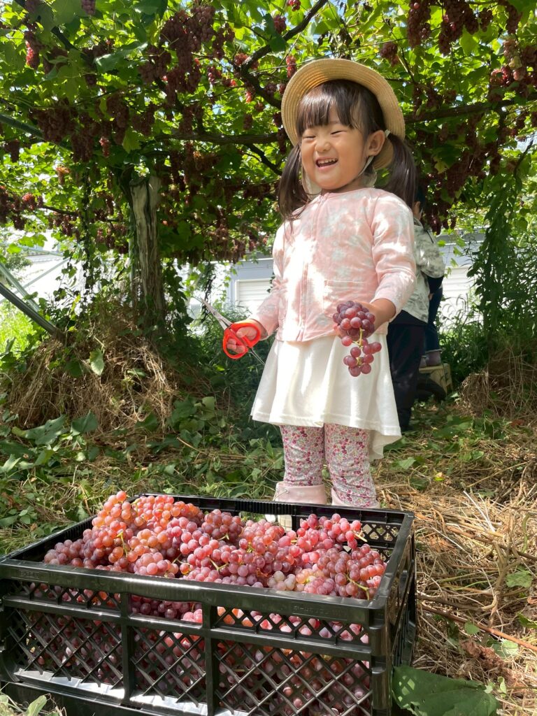 9月14日(日)、家族で山形県・東根市のぶどう畑へ。青空の下、子どもたちにとって初めての収穫体験は大盛り上がり。