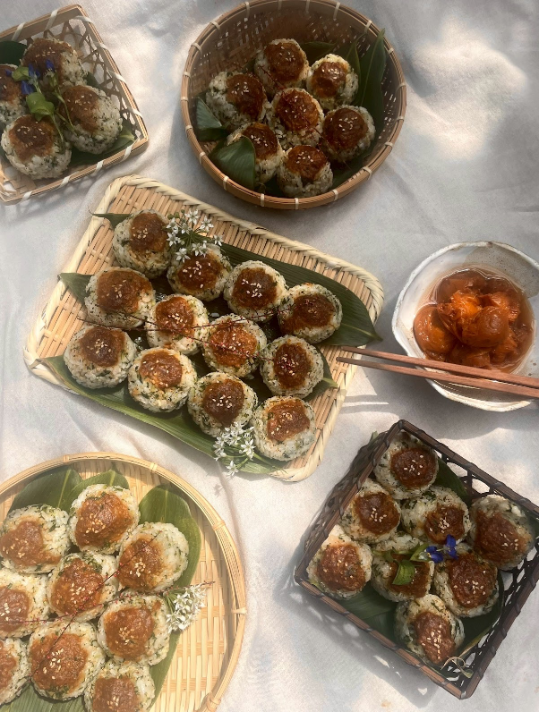 お昼は畑の中でおむすびランチ。料理家・新田増穂さんの感性が際立つ、美しくて凛としたおむすびに感激。